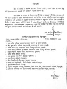 आदेश के मुताबिक, 25 दिसंबर, 31 दिसंबर और एक जनवरी को जिले के होटल, रेस्टोरेंट, बार व अन्य सार्वजनिक स्थलों पर सार्वजनिक कार्यक्रम और पार्टी आयोजित नहीं की जाएगी। उल्लंघन करने वालों पर आपदा प्रबंधन एक्ट-2005 और उत्तराखंड महामारी रोग कोविड-19 एक्ट के अंतर्गत कार्रवाई की जाएगी।
