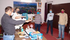 सूचना विभाग के मीडिया सेन्टर में जनसम्पर्क अधिकारी मुख्यमंत्री श्री विजय बिष्ट द्वारा अधिकारी व कर्मचारियों को कोविड संक्रमण बचाव, सर्तकता व मास्क पहने की शपत दिलाई गई। शपत में उपनिदेशक सूचना योगेश मिश्रा, अति जिला सूचना अधिकारी गोविन्द सिंह बिष्ट, मोहन फुलारा, सुधीर कुमार, एमसी जोशी, पवन नेगी, भूवन चन्द्र, आन सिंह,शरद पाण्डे आदि मौजूद थे।