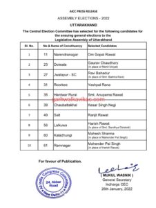 26 जनवरी, गढ़वाल का विकास डॉट कॉम, देहरादून। उत्तराखंड कांग्रेस ने आज प्रत्याशियों की अपनी तीसरी सूची जारी कर दी। इस सूची में जहां पूर्व CM हरीश रावत की सीट बदलने के साथ कुछ सीटों में प्रत्याशियों में बदलाव किया गया है, वहीं हरक सिंह रावत को फिलहाल टिकट से दूर रखा गया है। देखिये सूची
