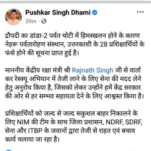 उन्होंने कहा कि प्रशिक्षार्थियों को जल्द से जल्द सकुशल बाहर निकालने के लिए NIM की टीम के साथ जिला प्रशासन, NDRF, SDRF, सेना और ITBP के जवानों द्वारा तेजी से राहत एवं बचाव कार्य चलाया जा रहा है।
