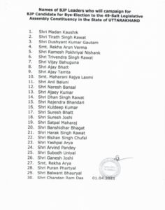देहरादून, (गढ़वाल का विकास न्यूज)। स्टार प्रचारकों के मामलें में जमकर किरकिरी के बाद BJP ने आज एक बार फिर से सल्ट विधानसभा उपचुनाव के लिए अपने स्टार प्रचारकों की सूची जारी की हैं। इस सूची में इस बार पूर्व मुख्यमंत्री त्रिवेंद्र सिंह रावत और पूर्व मुख्यमंत्री विजय बहुगुणा का नाम भी डाला गया है। विदित हो कि इससे पूर्व गत दिवस जारी की गयी सूची में पूर्व CM त्रिवेंद्र सिंह रावत व विजय बहुगुणा का नाम नहीं था, जिसके बाद भाजपा की जमकर किरकिरी हुई थी। हालांकि बाद में भाजपा ने नाम न होने का कारण लिपिकीय त्रुटि बताया।