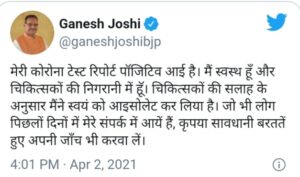 उन्होंने लिखा कि ‘ मेरी कोरोना टेस्ट रिपोर्ट पॉजिटिव आई है। मैं स्वस्थ हूँ और चिकित्सकों की निगरानी में हूं। चिकित्सकों की सलाह के अनुसार मैंने स्वयं को आइसोलेट कर लिया है।