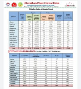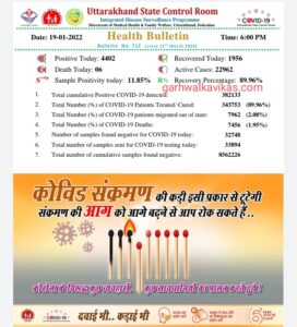 19 जनवरी, गढ़वाल का विकास डॉट कॉम, देहरादून। उत्तराखंड में कोरोना के मामलें थमने का नाम नहीं ले रहे है। स्वास्थ विभाग द्वारा आज जारी हेल्थ बुलेटिन में कोरोना के 4402 नए मामले सामने आए है, जबकि आज कोरोना से 6 मरीजो की मौत हुई है। बुलेटिन के मुताबिक आज जहां 1956 मरीजों ने कोरोना को मात दी, वहीं प्रदेश में कोरोना के एक्टिव मामलों की संख्या बढ़कर 22962 तक पहुँच गयी है।