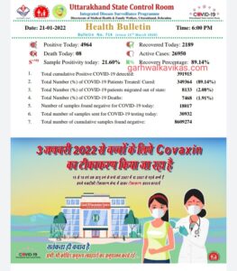 21 जनवरी, गढ़वाल का विकास डॉट कॉम, देहरादून। उत्तराखंड में कोरोना के मामलें थमने का नाम नहीं ले रहे है। स्वास्थ विभाग द्वारा आज जारी हेल्थ बुलेटिन में कोरोना के 4964 नए मामले सामने आए है, जबकि आज कोरोना से 8 मरीजो की मौत हुई है। बुलेटिन के मुताबिक आज जहां 2189 मरीजों ने कोरोना को मात दी, वहीं प्रदेश में कोरोना के एक्टिव मामलों की संख्या बढ़कर 26950 तक पहुँच गयी है।