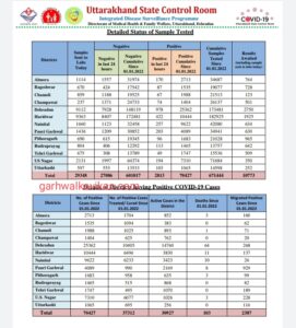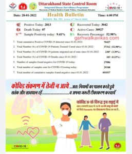 28 जनवरी, गढ़वाल का विकास डॉट कॉम, देहरादून। उत्तराखंड में कोरोना के मामलें थमने का नाम नहीं ले रहे है। स्वास्थ विभाग द्वारा आज जारी हेल्थ बुलेटिन में कोरोना के 2813 नए मामले सामने आए है, जबकि आज कोरोना से 7 मरीजो की मौत हुई है। बुलेटिन के मुताबिक आज जहां 3042 मरीजों ने कोरोना को मात दी, वहीं प्रदेश में कोरोना के एक्टिव मामलों में कमी आई है और यह संख्या 30927 तक पहुँच गयी है।
