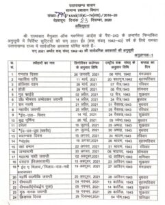 देहरादून, (गढ़वाल का विकास न्यूज)। वर्ष 2021 के लिए प्रदेश सरकार ने सरकारी अवकाश कैलेंडर जारी कर दिया है। इस बाबत सचिवालय सामान्य प्रसाशन ने राज्यपाल की मंजूरी के बाद आदेश जारी कर दिये है।