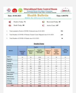देहरादून 10 अप्रैल, गढ़वाल का विकास डॉट कॉम। उत्तराखंड में आज कोरोना के 71 नए मामलें सामने आए है, जबकि 05 मरीजों ने कोरोना को मात दी। स्वास्थ्य विभाग द्वारा जारी हेल्थ बुलेटिन के मुताबिक प्रदेश में कोरोना मामलों की संख्या 147 हो गयी है।