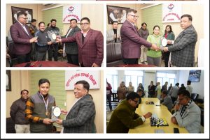कार्यक्रम में महानिदेशक सूचना श्री तिवारी द्वारा शतरंज प्रतियोगिता में विजयी रहे कैलाश रावत एवं उप विजेता राजेन्द्र सिंह कलूड़ा को पुरस्कृत किया गया। महिला वर्ग में कैरम सिंगल्स की विजेता श्रीमती आरती बिष्ट एवं उप विजेता सुश्री विदिशा नेगी को पुरस्कार प्रदान किये गये। कैरम प्रतियोगिता में पुरूष वर्ग के सिंगल्स श्रेणी के विजेता अतुल डिमरी एवं उप विजेता गजेन्द्र सिंह को पुरस्कृत किया गया। कैरम प्रतियोगिता के डबल्स श्रेणी में विजेता अतुल डिमरी एवं गजेन्द्र सिंह, उप विजेता चेतन कुमार पाण्डेय एवं राम सिंह परजोली को पुरस्कृत किया गया। यह खेल प्रतियोगिता विगत 12 एवं 14 दिसम्बर, 2025 को सूचना भवन सभागार में आयोजित की गई थी।