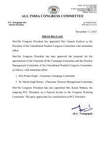 नई दिल्ली/देहरादून, गढ़वाल का विकास डॉट कॉम। उत्तराखंड में संगठनात्मक बदलाव करते हुए कांग्रेस हाईकमान ने गणेश गोदियाल को प्रदेश कांग्रेस कमेटी (PCC) का नया अध्यक्ष नियुक्त किया है। अखिल भारतीय कांग्रेस कमेटी के महासचिव के.सी. वेणुगोपाल द्वारा मंगलवार को जारी आधिकारिक प्रेस विज्ञप्ति में इस नियुक्ति की घोषणा की गई।