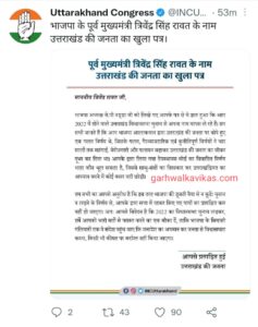 20 जनवरी, गढ़वाल का विकास डॉट कॉम, देहरादून। उत्तराखंड के पूर्व मुख्यमंत्री त्रिवेन्द्र सिंह रावत के चुनाव नहीं लड़ने की इच्छा जताने के बाद जहां BJP में पार्टी प्रत्याशी को लेकर रणनीति बननी शुरु हो गयी है, वहीं कांग्रेस ने त्रिवेंद्र के निर्णय के बाद एक पत्र ट्वीट किया है। ट्वीट में कांग्रेस ने त्रिवेंद्र के नाम उत्तराखंड की जनता का खुला पत्र बताते हुए सियासी हमला किया है।