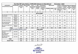 सूचना अधिकार कार्यकर्ता नदीम उद्दीन एडवोकेट ने उत्तराखंड के ग्राम्य विकास आयुक्त कार्यालय से सांसद निधि खर्च सम्बन्धी सूचना चाही थी। जिसके उत्तर में लोक सूचना अधिकारी उपायुक्त प्रशासन, हेमन्ती गंुजियाल द्वारा अपने पत्रांक 245531 के साथ सांसद निधि खर्च के दिसम्बर 2025 के विवरण की प्रति उपलब्ध करायी है। जिसमें दिसम्बर 2025 के अंत तक की उत्तराखंड के लोक सभा सांसदों की सांसद निधि खर्च का विवरण दिया है।