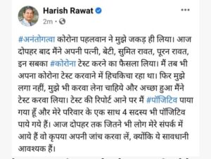 हरीश रावत ने ट्वीट करते हुए लिखा कि ‘कोरोना पहलवान ने मुझे जकड़ ही लिया. आज दोपहर बाद मैंने अपनी पत्नी, बेटी, सुमित रावत, पूरन रावत का कोरोना टेस्ट करने का फैसला लिया. टेस्ट की रिपोर्ट आने पर मैं पॉजिटिव पाया गया हूं और मेरे परिवार के 4 सदस्य भी पॉजिटिव पाए गए हैं।