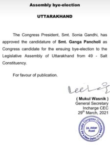 देहरादून, (गढ़वाल का विकास न्यूज)। उत्तराखंड की सल्ट विधानसभा सीट पर होने वाले उप चुनाव के लिए कांग्रेस ने भी अपना प्रत्याशी घोषित कर दिया हैं। कांग्रेस भाजपा हाईकमान ने इस सीट पर गंगा पंचोली को अपना प्रत्याशी बनाया हैं।